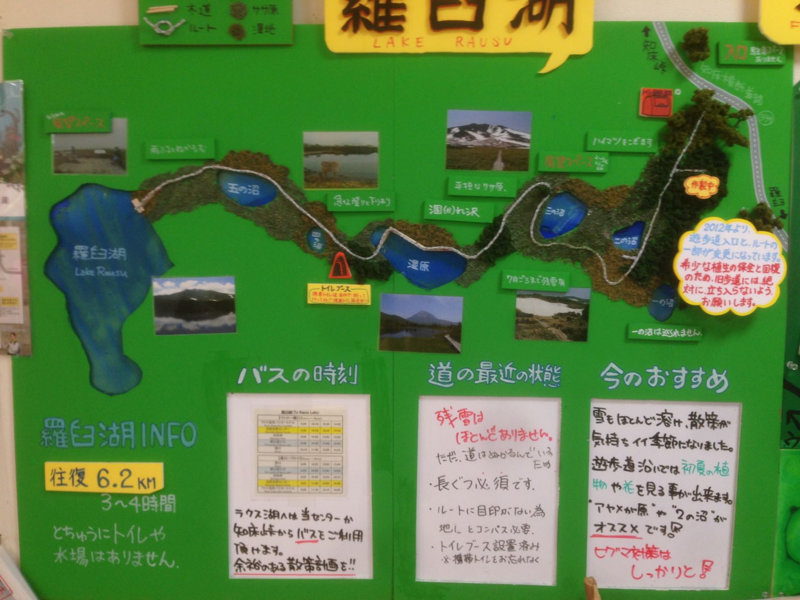 도로에 있는 입구에서 호수까지는 약 3KM 거리이고 표고 차는 80M 정도로 1시간 반 정도 걸린다. 고도는 약 700M이지만 높은 위도 때문에 일본 本州의 2,000M와 비슷한 기온이라 한다. 어른에게는 그리 힘든 코스는 아니지만, 많은 사람들이 찾는 등산로가 아니어서 관목이 우거지면 길은 매우 좁고 바닥은 질퍽거리는 곳이 많다. 목도는 매우 제한적이고 등산로를 보호하기 위해 일부 구간에는 큰 돌을 깔아 놓았다. 왕복 3-4시간을 잡으면 된다고 되어 있었고 중간에 화장실은 없다. 그래서 중간에 携帯トイレブース[휴대 Toilet Booth]를 입구에 回収ボックス [회수Box]를 두고 개인이 가져온 휴대화장실을 사용하도록 유도한다.