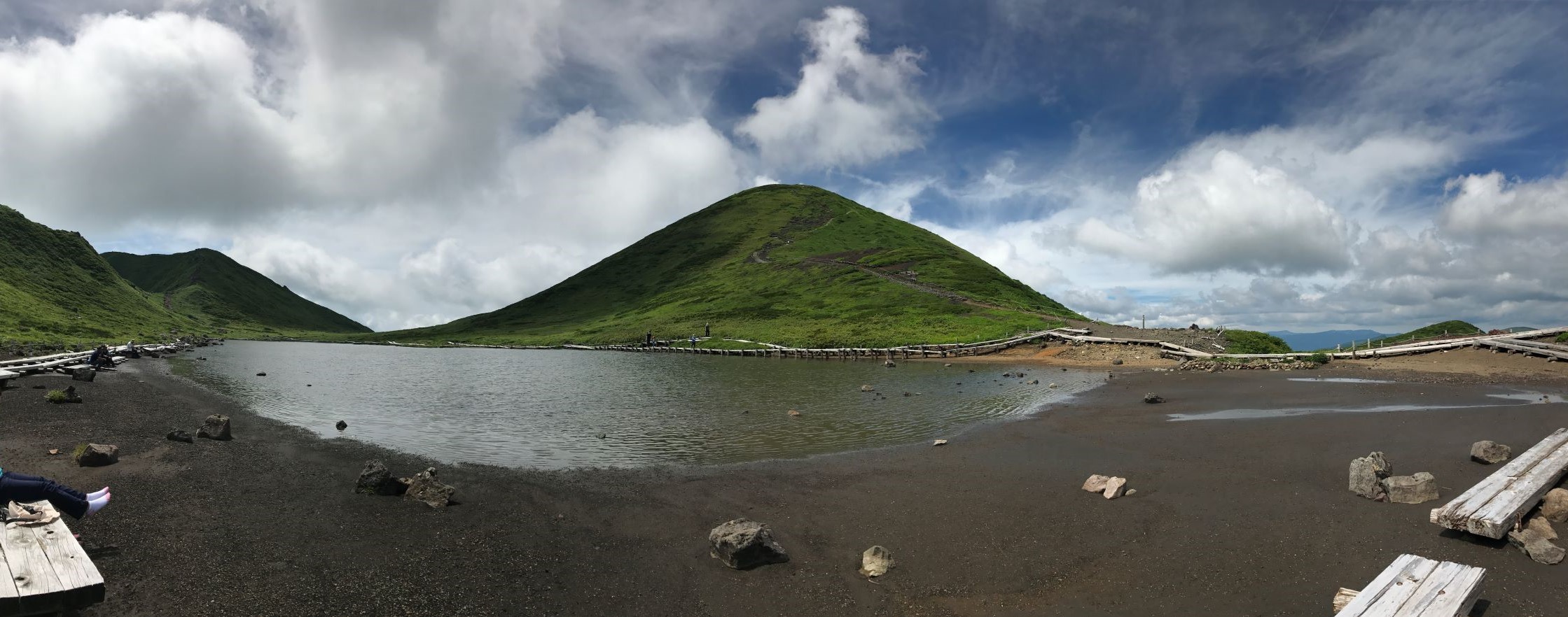 목도는 연못 주위로 빙 둘러 있다. 저 끝에 피난 대피처인 阿弥陀池避難小屋이 있다. 이 오두막 주위의 목도에 걸쳐 앉아 휴식을 취한다. 오두막 안에는 비상시에 대비한 물품들이 있고 그 옆에는 화장실 건물도 있다. 꽤 많은 사람들이 휴식하고 있고 몇몇은 정상으로 올라간다. 20분이면 올라가겠지만 어린 아이들과 무리하지 않고 바라보기만 하기로 했다. 봉우리에는 높은 나무는 없고 관목과 풀뿐이다.딸아이와 연못 주위를 돌며 사방을 둘러본다. 연못의 물은 따뜻한 듯하다. 다른 봉우리로 향하는 등산로도 목도로 잘 되어 있다.