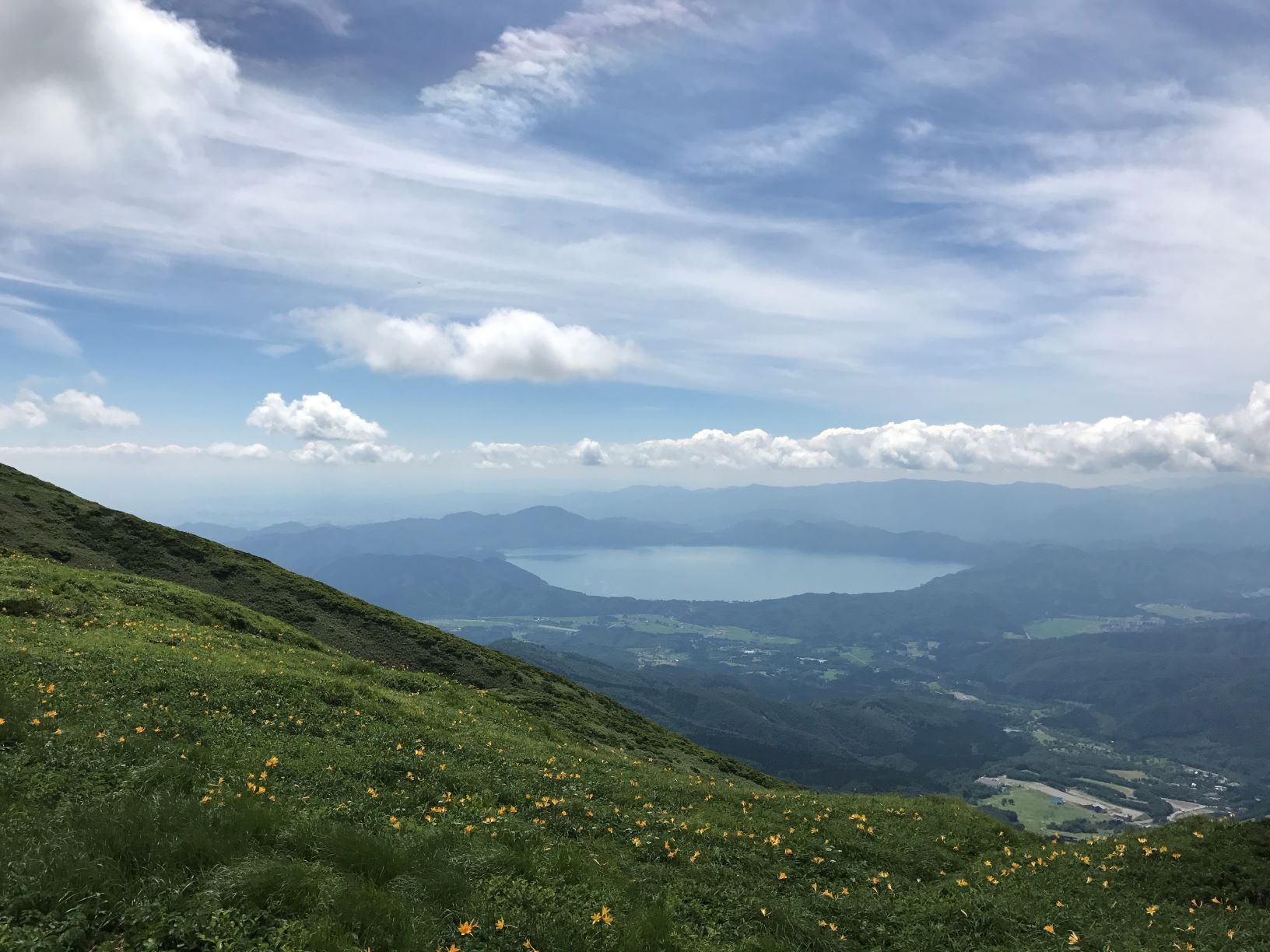 입구에는 역시 곰(クマ) 주의 표시가 있다. 일본 산악 지역에는 곰이 많다고 한다. 일본에서 야생 곰은 딱 한 번 본 적이 있는데 다행히 산행 중에 마주친 것은 아니었고 숙소 주위에 나타난 새끼 곰이었다. 처음 등산로는 키 작은 관목 사이로 가는 길이다. 두 딸 아이는 거리낌 없이 올라간다. 정상 밑 阿弥陀池Amidaike까지 1시간 안쪽이니 큰 불평 없이 올라갈 것이다. 곧 片倉岳展望台(Katakuratake전망대) 표시가 나온다. 片倉岳Katakuratake를 잘 볼 수 있는 지점이다. 여기서부터는 나무의 키는 더 작아지고 바닥은 거친 화산석이라 천천히 걸어야 한다. 조금 더 올라가면 오른쪽에 거대한 호수 田沢湖Tazawako가 한눈에 들어온다. 능선에 핀 노란 고산화와 함께 멋진 그림을 만들고 있다. 햇살은 따갑지만 그리 덥지는 않다. 고개 들어 하늘을 보니 햇무리가 생겨 예쁘다.