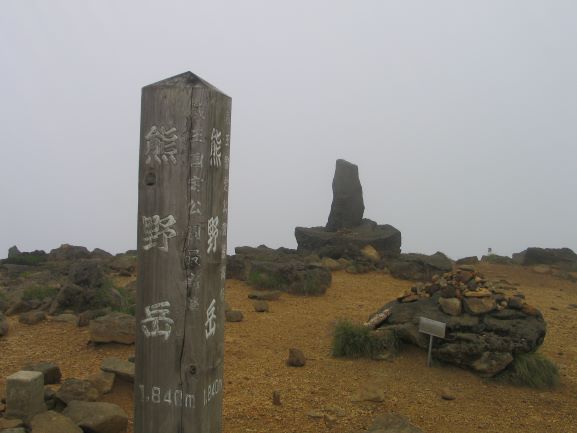 앞에 보이는 돌집이 있는 봉우리가 熊野岳Kumanodake이고 1,840M이다. 그리고 출발 지점인 휴게소 오른쪽에 신사가 있는 봉우리는 刈田岳Kattadake, 1,758M이다. 여기 작은 신사는 刈田嶺神社(奥宮)[Kattamine Shrine]이다. 이 신사 올라가는 길은 그나마 조금 경사가 있는데, 올라가서 다른 각도에서 오카마를 보고 주위의 다른 산들의 경치를 바라보는 것도 좋았다.