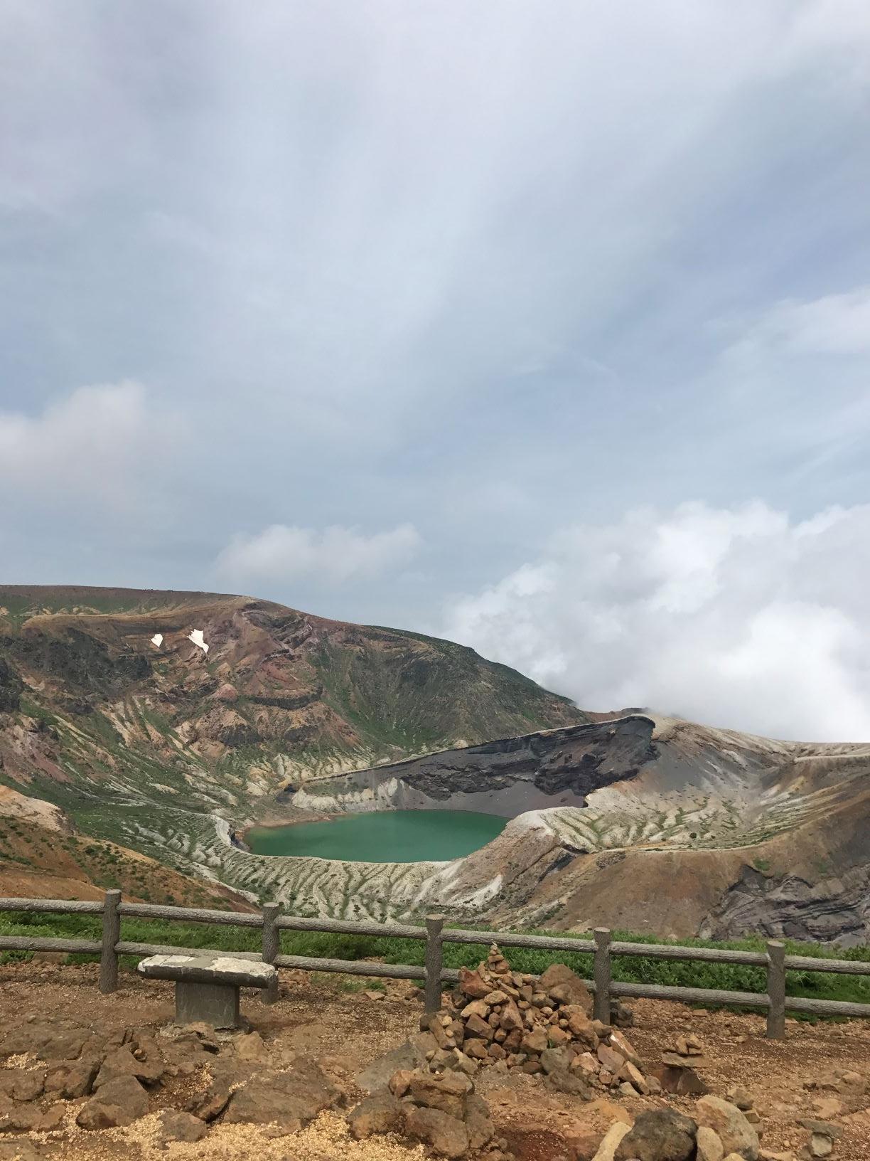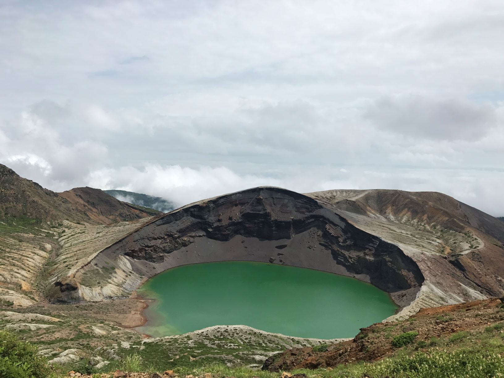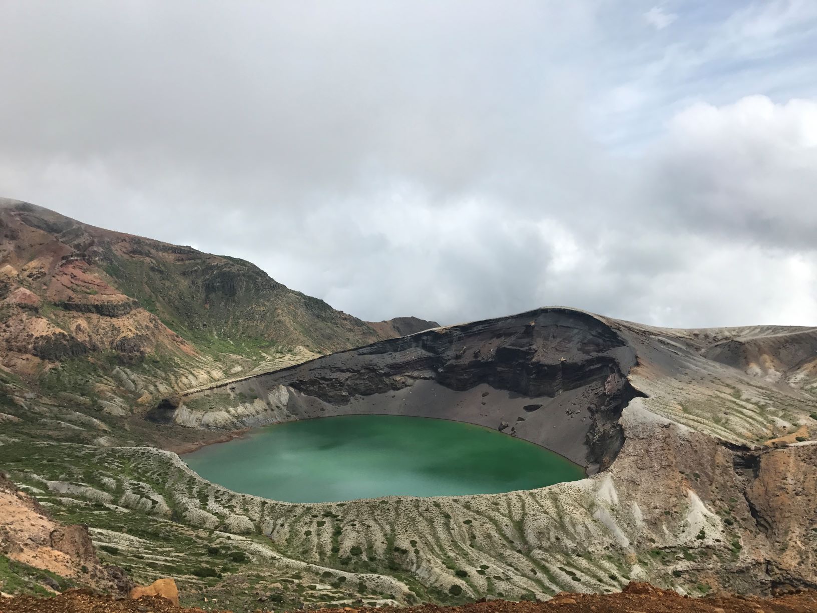 お釜Okama는 말 그대로 큰 가마솥 모양이다. 분화구가 무너진 칼데라 모양은 맞지만 그 안에 담긴 초록색 액체는 물이 아닌 화학약품 같다. 실제로 이 물은 pH 3.5의 산성으로 생물이 살 수 없다. 이 호수의 다른 이름은 五色沼Goshikinuma (-색이 변하는 일본의 여러 호수에 이 이름이 붙어있다)이니 다른 색을 띌 때도 있을 것이다. 2006년 여름과 2017년 여름에는 에메랄드 빛이었지만, 자료에 의하면 호수의 화산 활동에 의해 색이 변하며 맑은 유리 색, 탁한 흰 색, 붉은 색, 때론 검은 색일때도 있다고 한다. 하지만 이미지 검색에서도 대부분은 녹색이었다.