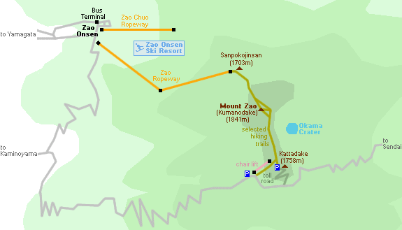 위 지도의 주차장 표시는 蔵王山頂レストラン[자오산정레스토랑]이다. 仙台Sendai 시내에서 차로 1시간 반 정도면 올 수 있다. 마지막에 요금소를 지나 蔵王ハイライン[자오하이라인]이라는 길을 통해 오게 되어 있다. 2017년에 요금은 540엔이었다. 물론 겨울에는 이 길은 통제된다.
