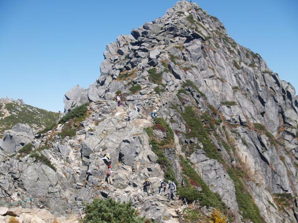 우선 2,956M 駒ヶ岳KomagaTake까지 오르는 등산을 시작했다. 처음 언덕은 약 250M 고도를 올라가는 길은 상당이 가파르며 돌계단 비슷한 길의 연속이다. 날씨가 좋아 가벼운 옷차림의 관광객이 많다. 어린 아이와 함께 온 부모의 모습도 가끔 보인다. 한 육중한 몸매의 서양인은 매우 힘들어하고 있었다. 이 언덕을 八丁坂이라 하고, 이 언덕을 다 올라 능선이 나오면 그 곳을 乗越浄土라 하며 약 2,860M 지점이다. 여기까지 왔으면 가장 어려운 코스를 마친 것이다. 아이들에게는 약간 무리일 수도 있는 급경사 언덕이다. 고도가 높아서 인지 작은 아이는 머리가 약간 아프다고 한다. 乗越浄土에서 왼쪽으로 보이는 바위 봉우리가 宝剣岳[Mount Hōken, 2,931M]이며 앞 쪽으로 몇 개의 건물이 보인다. 宝剣山荘[Hōken sansō]는 간단한 식사도 판매하는 산장이다. 캔맥주도 팔고 있었으며 유료 화장실도 있다. 이 근처에서 준비해 간 도시락으로 점심을 한다. 고된 산행 뒤라 아이들은 밥이 꿀 맛이다. 주위의 다른 일본인들도 삼각김밥이나 주먹밥으로 점심을 하고 있다. 점심 후에 산장에서 소프트아이스크림을 사 먹었다. 일본의 소프트아이스크림(일본말로 ソフトクリーム라 한다.)은 원래 맛있기도 하지만 해발 2,900M 지점에서 먹는 그 맛은 매우 훌륭하다.