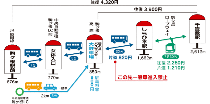 우선 차로 菅の台バスセンタ[Suganodai BC Bus Stop]까지 가서 주차하고, しらび平駅[Shirabidaira Station]까지 가는 버스표를 산다. 외국인 여권이 있으면 할인해 준다. 이 버스는 800M의 고도를 올라 가는 30분 거리이며 창밖 풍경도 괜찮다. しらび平駅에 내리면 바로 ropeway를 탄다. 이 역 주변에도 볼만한 거리가 있지만 하루 코스에 넣기는 무리이다. しらび平駅에서 千畳敷駅까지는 표고차가 950M나 되며 경사길이도 2.3KM가 넘지만 매우 빠른 속도로 7분 30초 만에 올라간다. 직접 타보면 다른 케이블카와 달리 빠른 속도(초속 7M)를 체감할 수 있다. 발 아래 다양한 산과 계곡의 모습을 보다 보면 순식간에 도착한다.