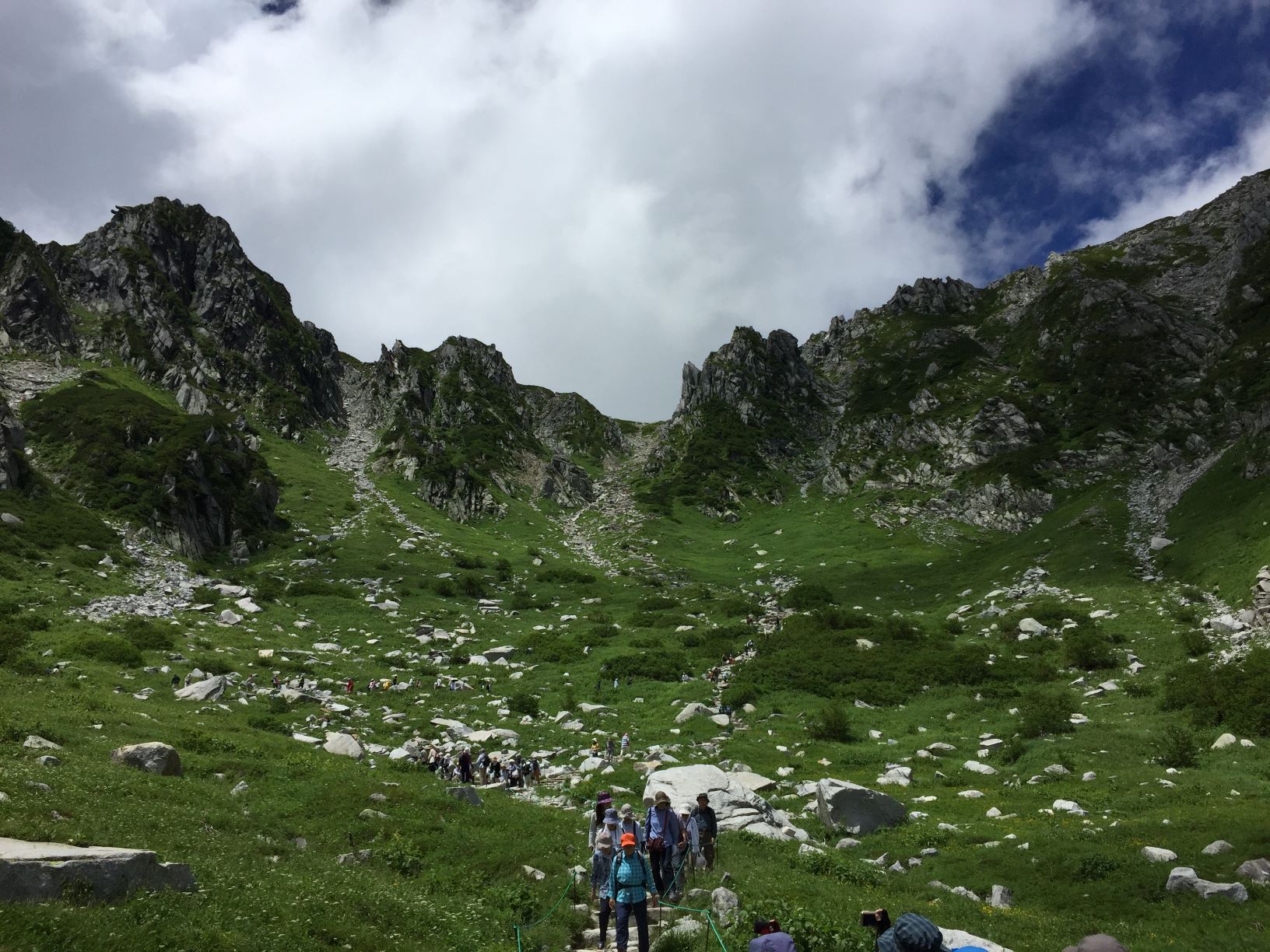 千畳敷駅에 내려 밖으로 나가면 시원한 공기가 맞아 준다. 아래쪽은 30도가 훌쩍 넘는 무더운 여름이지만 여기는 18도에 습도는 59% 가장 상쾌한 날씨이다. 앞 쪽에는 전에 사진으로만 보았던 그 모습, 빙하의 침식으로 인해 빚어진 멋진 암벽과 푸르름의 조화. 그 모습을 드디어 두 눈으로 보게 된 것이다. 우리나라에도 바위산이 많지만, 일반적인 바위산과는 다른 신비로운 모습이다. 한참을 지켜보고 난 후 아이들과 함께 사진을 찍으며 경치를 즐겼다.