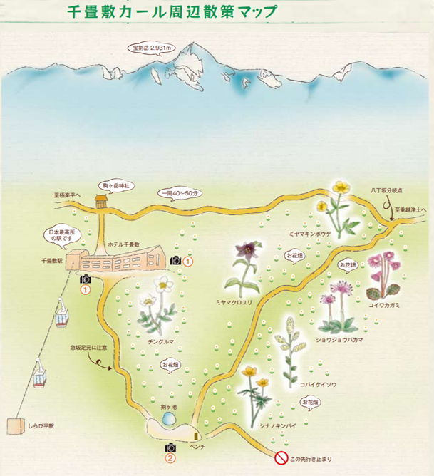 千畳敷カール, 이름이 생소하고 어렵다. 千畳敷는 여러 곳에서 지명으로 쓰이고 있는데 올해 찾은 和歌山Wakayama의 바위가 유명한 바닷가 이름도 千畳敷이었다. 일천 천, 거듭 첩, 펼 부. 글자 뜻대로 보면 천 조 개의 다다미가 펼쳐진 듯 넓은 곳이란 뜻이다. 위 사진의 아래 쪽에는 연못이 있고 40분 정도에 둘러볼 수 있는 넓은 평탄한 지역이 있다. 아래 맵과 사진을 통해 확인할 수 있다.