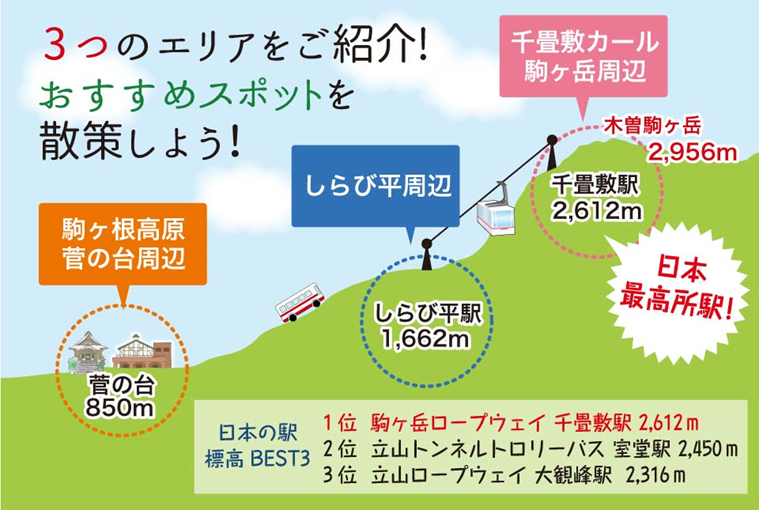 해발 2,612M에 위치한 千畳敷駅(ホテル千畳敷와 같은 건물에 있다)까지 ロープウェイropeway(한국의 케이블카에 해당)로 올라 간다. 홈페이지 www.chuo-alps.com에 자세하게 설명되어 있다. 이 역은 일본에서 가장 높은 역이라 자랑하고 있다.