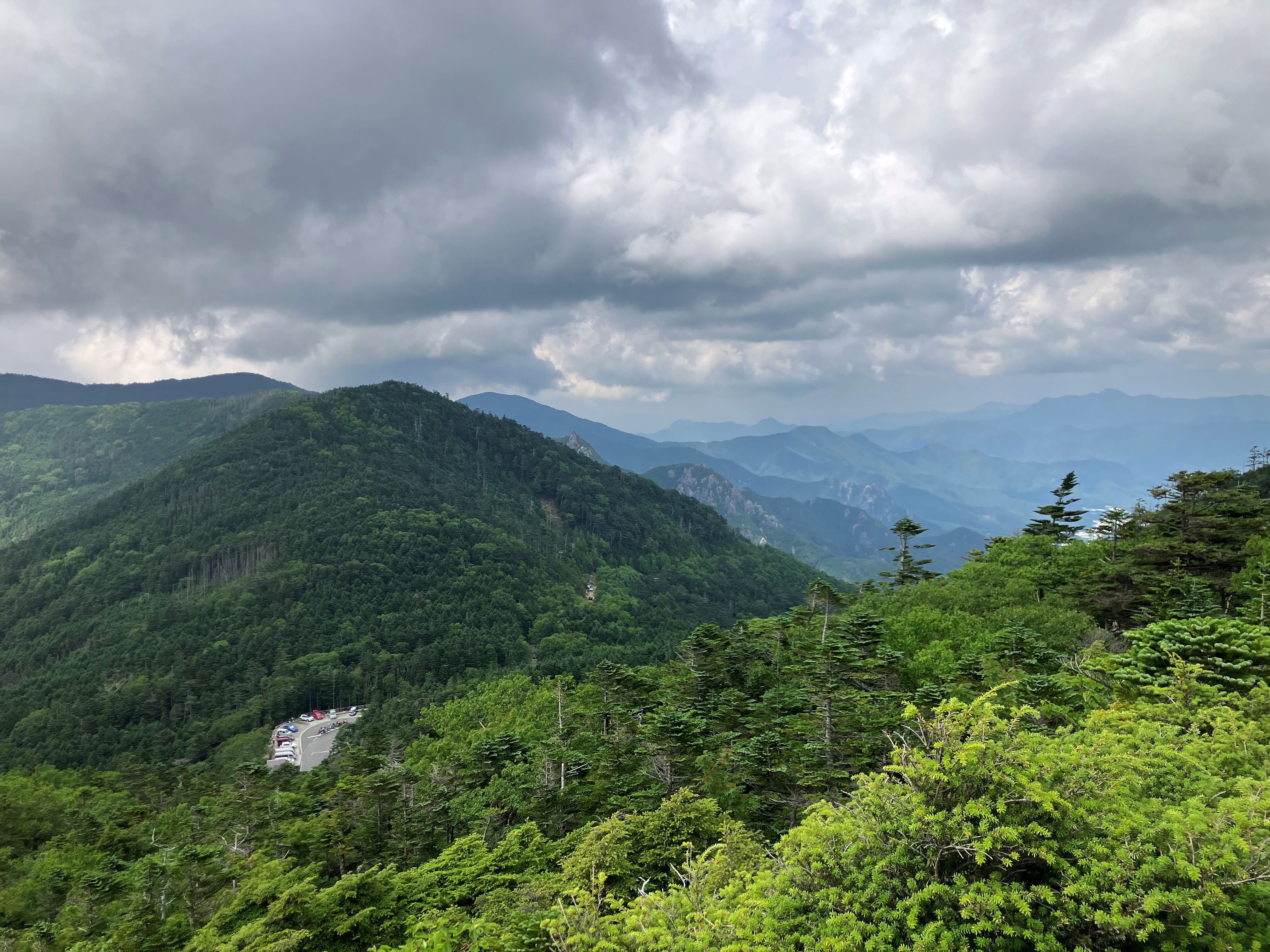 여기서부터는 일반도로가 아니라 林道이다. 지도에도 11인승 이상은 갈수 없고, 포장도로이지만 길이 좁아 마주 오는 차를 주의하며 가라고 안내하고 있다. 실제로 마주오는 차를 피해 멈춰 기다려야 하는 경우가 여러 번 있었다. 평일이라면 차량이 많지 않아 괜찮겠지만, 주말에는 꽤 많은 차가 다녀 조심해야 한다. 고개에 올라가면 30대 정도의 주차장이 있다. 하지만 주말에는 차가 많아 길 가에 주차되어 있는 차도 많다고 들었다. 실제 올라간 7월 29일이 토요일이어서 우리도 길가에 주차했었다. 아래 시내는 최고 35도까지 올라가는 무더운 날이었지만 이 고개가 이미 2,365M이니 공기가 매우 시원하고 상쾌하다. 오전 11시 경이었는데 상당수의 일본인들이 이미 산에서 내려와 돌아갈 채비를 하고 있었다. 이 고개에서 오른쪽으로 올라가면 꿈의정원 쪽이고 왼쪽으로 가면 金峰山_KinpuSan (2,599M)으로 올라가는 등산로이다. 지도에 2시간 반으로 되어 있으니 보통의 성인 남자라면 2시간 정도에 갈 수 있을 것이다. 우리 가족은 오른쪽 꿈의정원 쪽으로 출발한다.