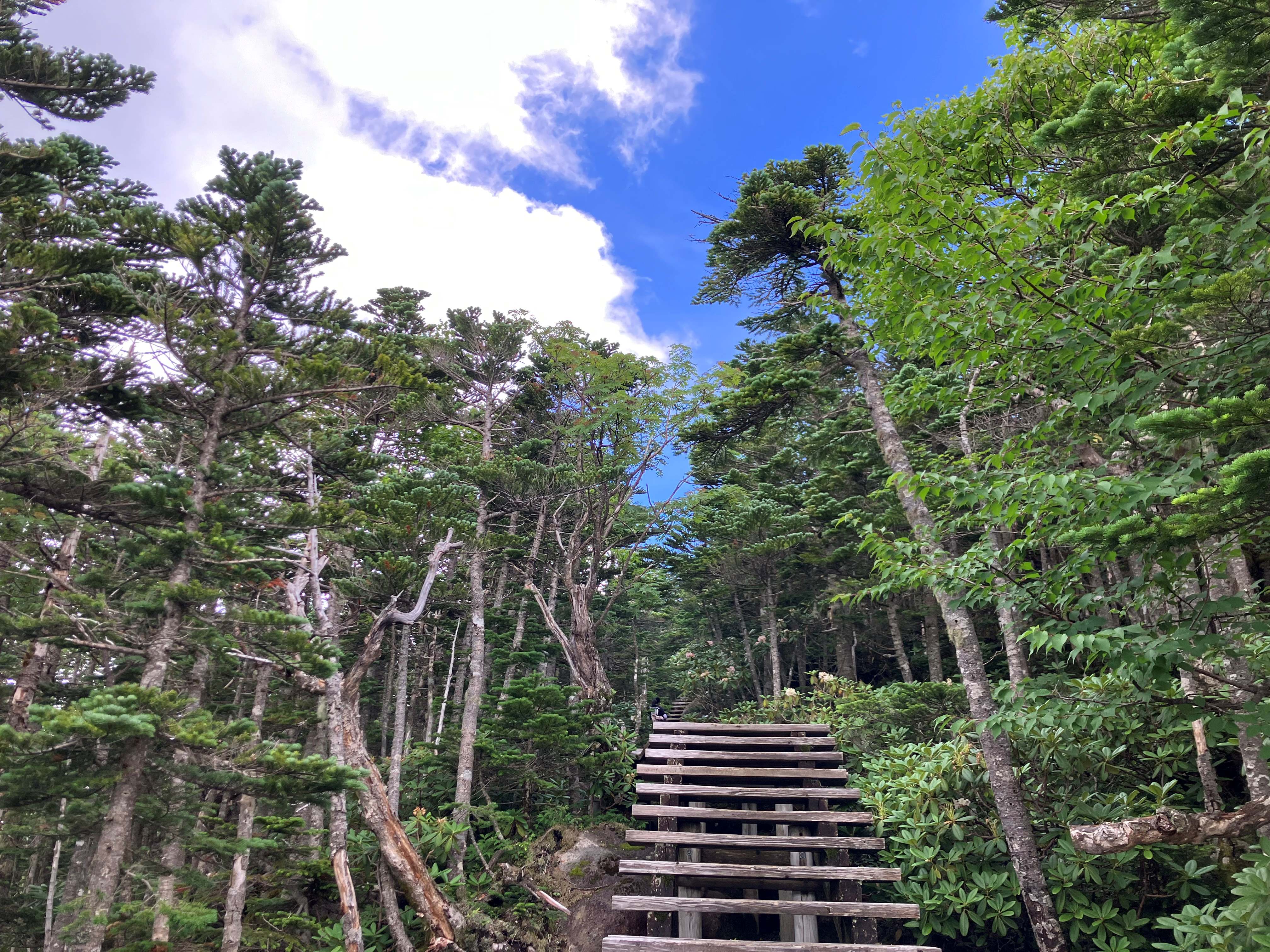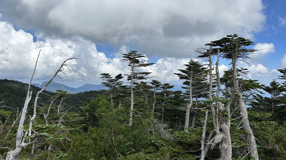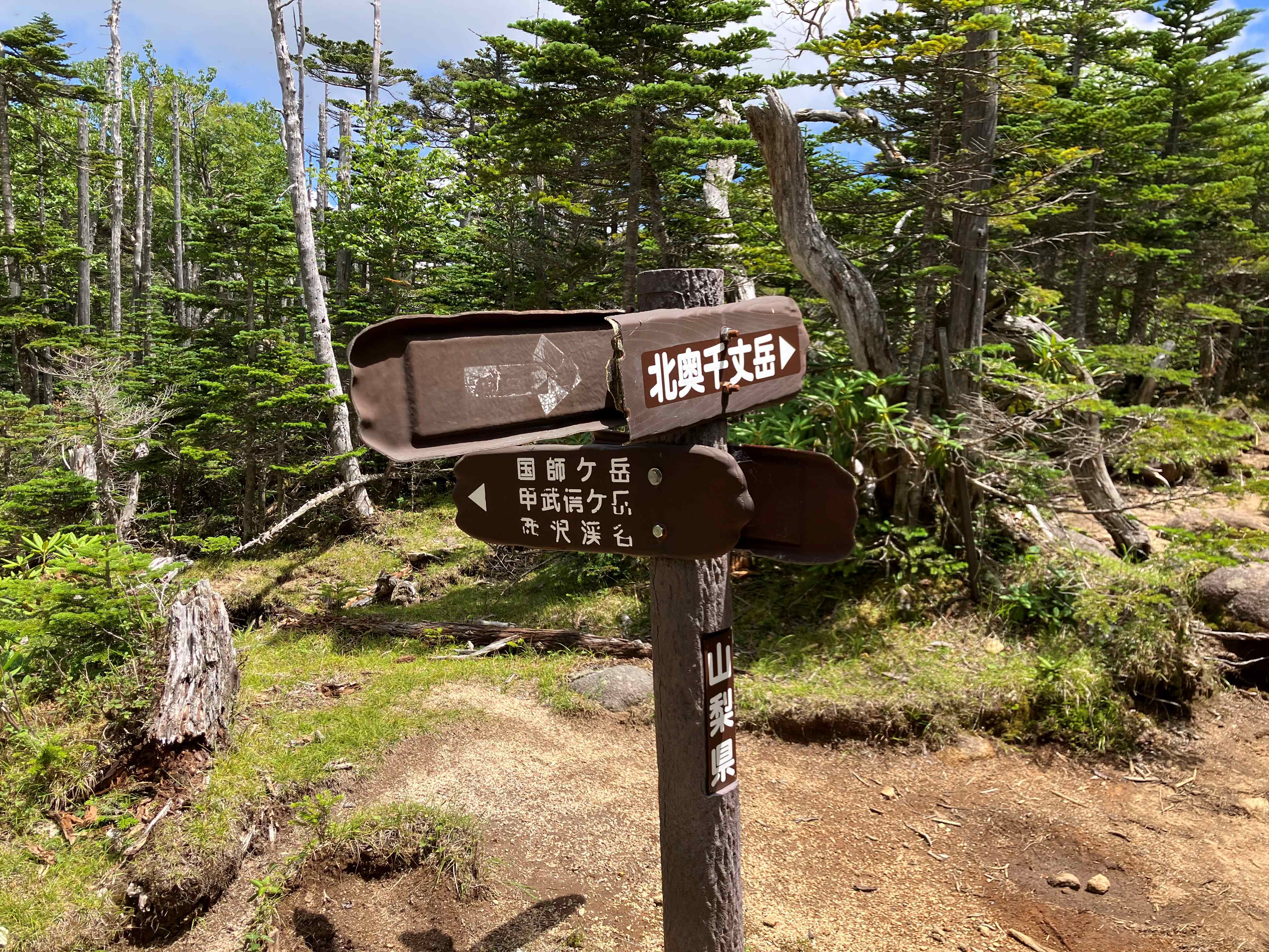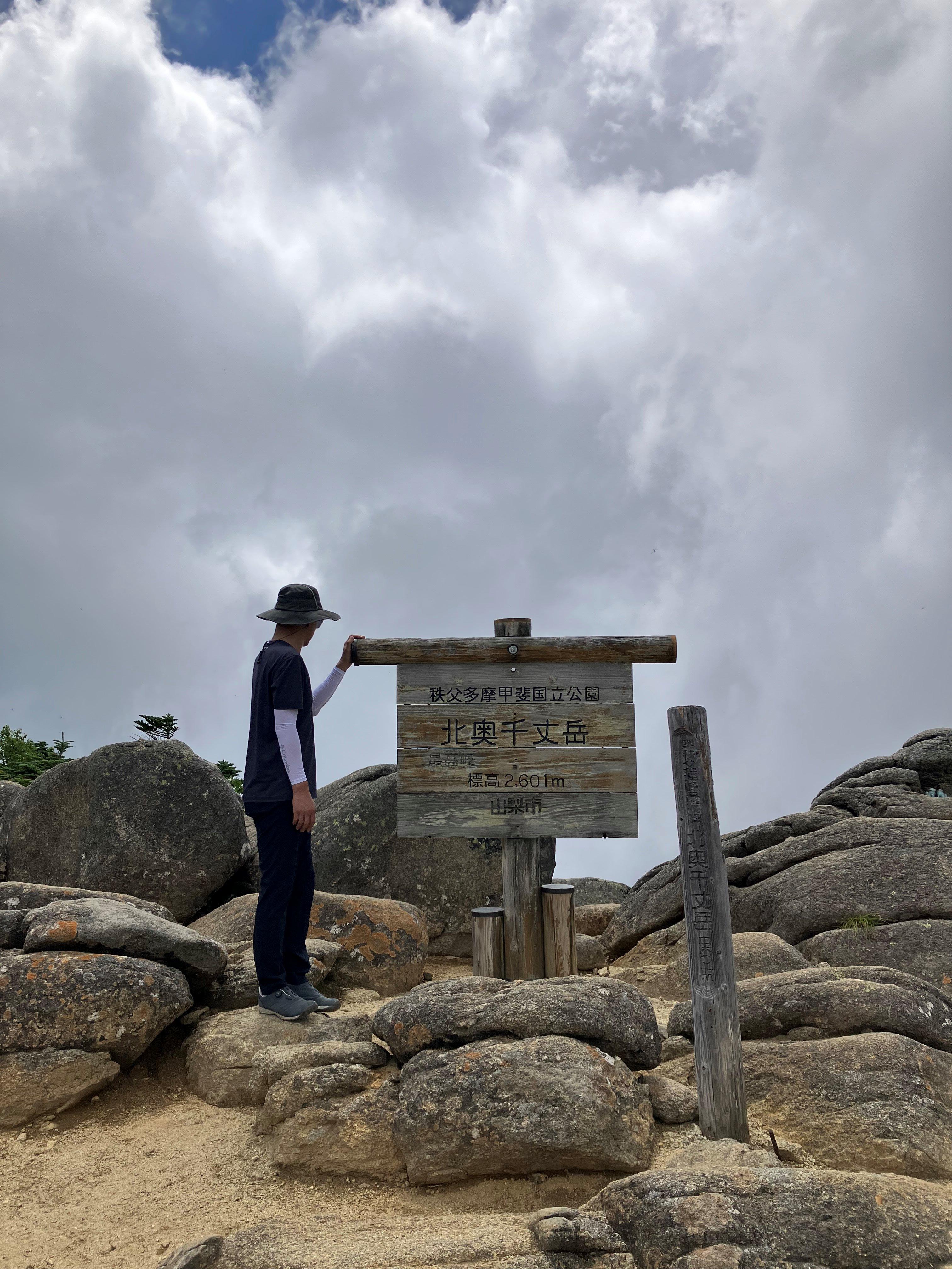 한참 동안은 제법 심한 경사로 올라가고 탁 트인 능선이 나오면서 한숨 돌려본다. 바람은 매우 시원하고 주위 경치는 전형적인 고산지대의 모습이다. 능선길을 조금 올라가면 두 봉우리로 올라가는 분기점이고 나무 벤치에서 잠시 쉬어간다. 오른쪽은 2,601M 北奥千丈岳_Kitaokusenjodake 이고, 왼쪽은 2,592M 国師ヶ岳_Kokushigadake 이다. 힘들어하는 둘째를 놔두고 첫째와 함께 北奥千丈岳에 오른다. 10분도 안 걸려 정상에 도착한다. 역시 높은 정상에 오르는 기분은 뿌듯하다. 누구나 그렇듯 정상에서 주위를 바라보며 머릿속을 비워본다. 정상 표지목에 최고봉이라 써있다. 사실 등산로 경로에 위치한 国師ヶ岳과 金峰山이 주봉이고 이 봉우리는 등산로에서 살짝 옆에 있지만 이 奥秩父 지역에서의 최고봉이다. 정상에서 내려와 国師ヶ岳을 다녀올 예정이었지만, 둘째가 힘들어하여 하산하기로 하였다.